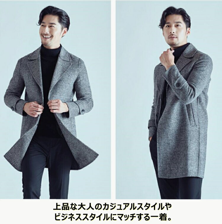着回し力バツグンのチェスターコートで ロング丈なのでスーツとの相性も良く プライベートとビジネス両方で活用できます。