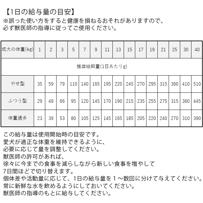 【原材料】 乾燥鶏肉、タピオカ、鶏脂、ジャガイモ、加水分解サーモンタンパク、乾燥卵、乾燥ニンジン、乾燥豆、不溶性エンドウ豆繊維、サーモンオイル、乾燥魚、キャロブパウダー(イナゴマメ)、ビール酵母、ビタミン類、ビートパルプ、乾燥カモ肉、キシロオリゴ糖(0.4%)、ミネラル類、L-カルニチン、タウリン、オタネニンジン(0.01%)、凍結乾燥メロン果実(SOD源 0.005%)、酸化防止剤(ミックストコフェロール、ローズマリー抽出物) 【分析値】(100kcalあたり) EPA+DHA:105.54mg ナトリウム:0.03g カリウム:211mg リン:106mg 鉄:3.83mg 銅:0.32mg 亜鉛:3.96mg L-カルニチン:5.28mg マグネシウム:16mg タウリン:52.77mg ビタミンA:660IU ビタミンE:16IU ビタミンC:5.28mg ビタミンD3:42.22IU ヨウ素:0.06mg マンガン:0.84IU 【代謝エネルギー】 100gあたり約379kcal 【分析値】(100kcalあたり) EPA+DHA:105.54mg ナトリウム:0.03g カリウム:211mg リン:106mg 鉄:3.83mg 銅:0.32mg 亜鉛:3.96mg L-カルニチン:5.28mg ビタミンA:660IU ビタミンE:16IU ビタミンC:5.28mg ビタミンD3:42.22IU ヨウ素:0.06mg マンガン:0.84IU 【内容量】2kg 【1日の給与量の目安】 誤った使い方をすると健康を損ねるおそれがありますので、必ず獣医師の指導に従ってご使用ください。
