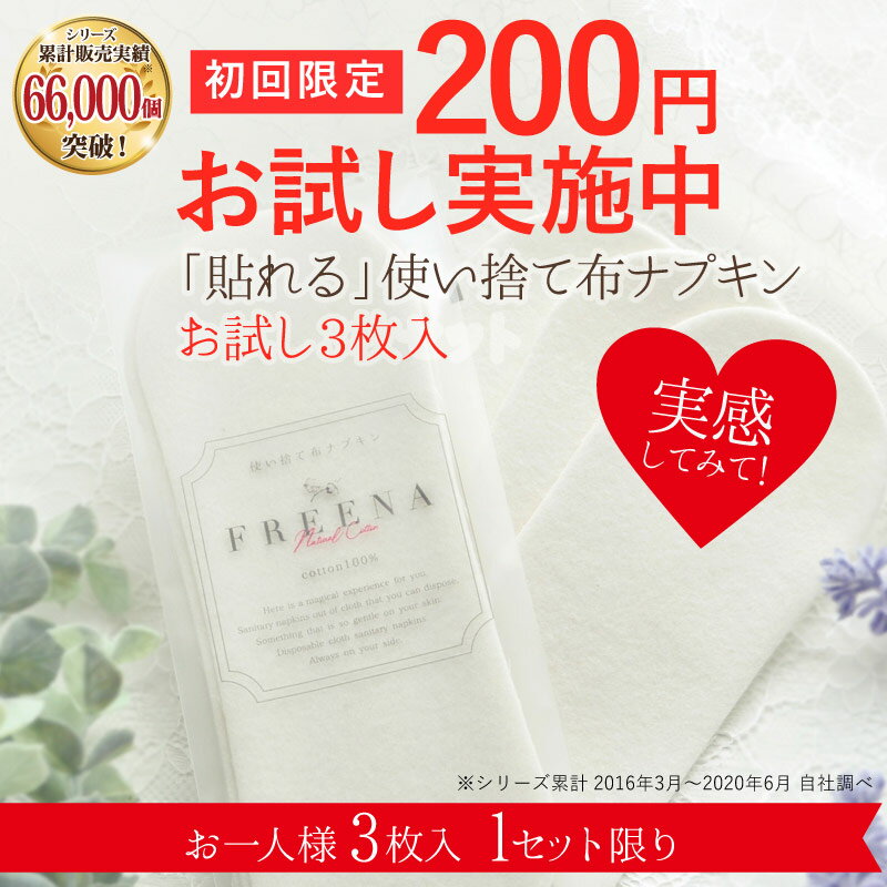 FREENA(フリーナ)は、布ナプキンの肌ざわりを気軽に体感できる「使い捨てタイプ」の布ナプキンです。